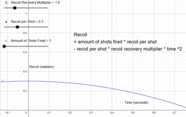 I used Geogebra to set up a graph function to calculate how fast I wanted the recoil recovery to be. This showed me how much recoil the player would have depending on how many shots they fired, and how fast it would recover.