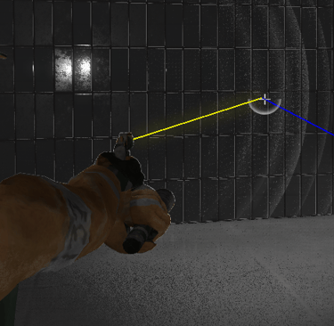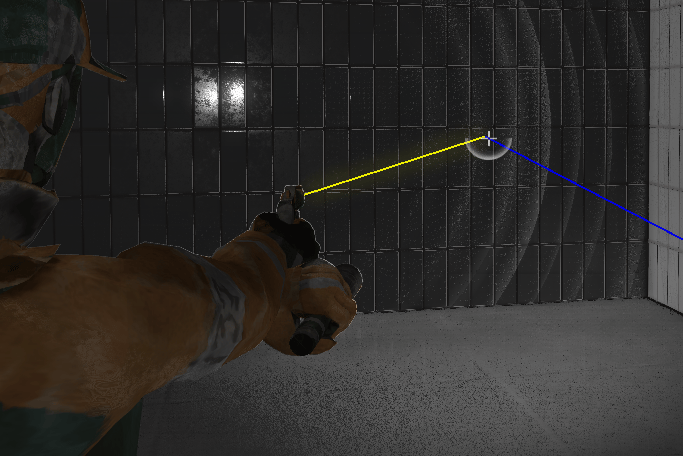 The raycasting for gunshots. The blue ray is coming from the camera and goes along the camera's forward direction. The yellow ray is shot from the gun to the camera ray's collision point