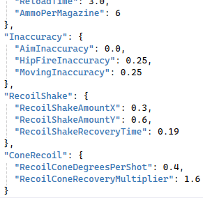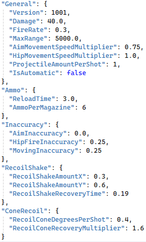 In preparation for adding more weapons, I created a quick and basic tool in the form of .json text files. The purpose of this was to simplify the creation of new guns and to make it accessible for designers without them needing to access the code.