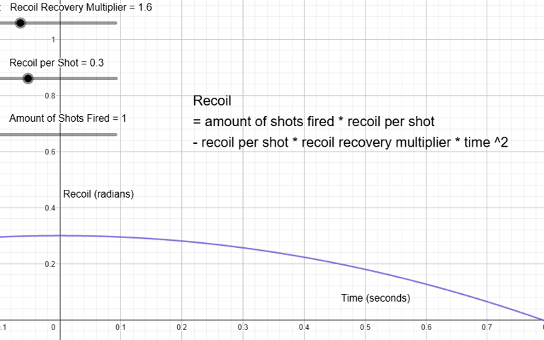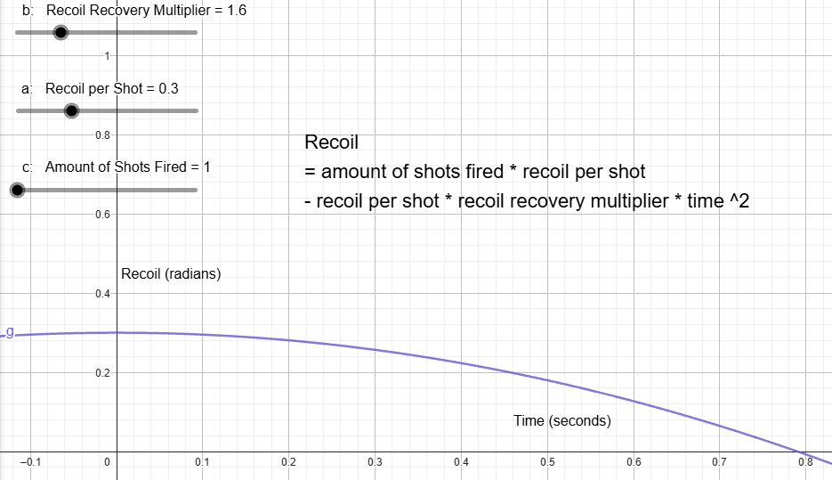 I used Geogebra to set up a graph function to calculate how fast I wanted the recoil recovery to be. This showed me how much recoil the player would have depending on how many shots they fired, and how fast it would recover.