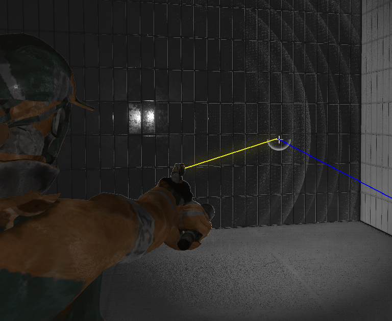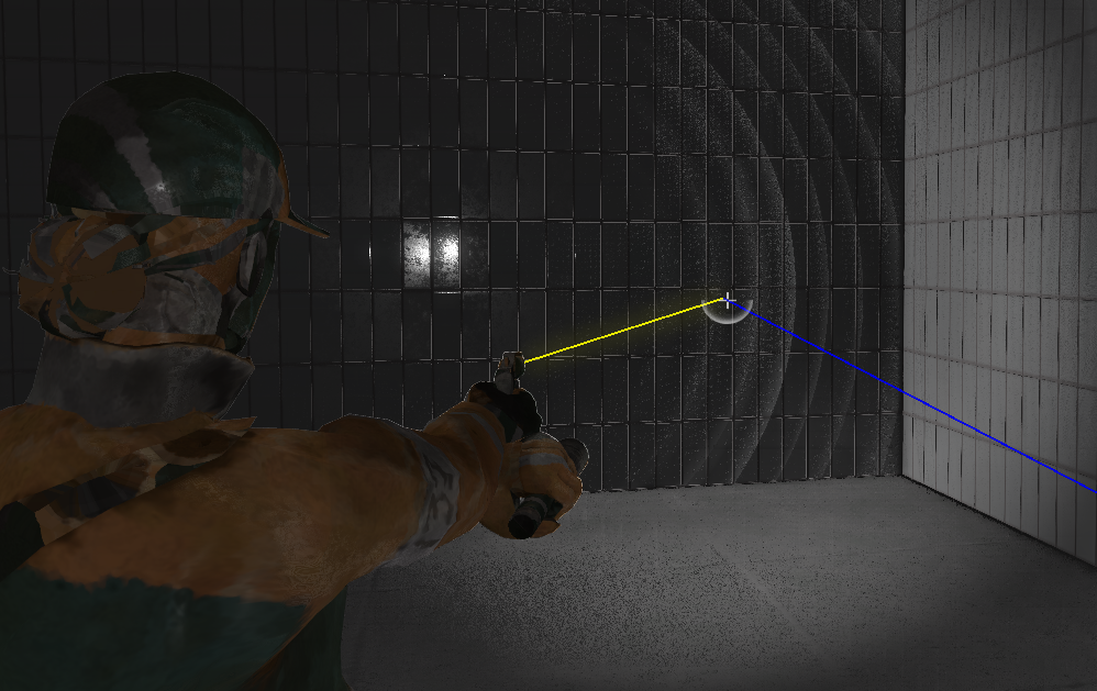 The raycasting for gunshots. The blue ray is coming from the camera and goes along the camera's forward direction. The yellow ray is shot from the gun to the camera ray's collision point