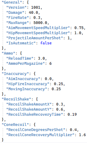 In preparation for adding more weapons, I created a quick and basic tool in the form of .json text files. The purpose of this was to simplify the creation of new guns and to make it accessible for designers without them needing to access the code.